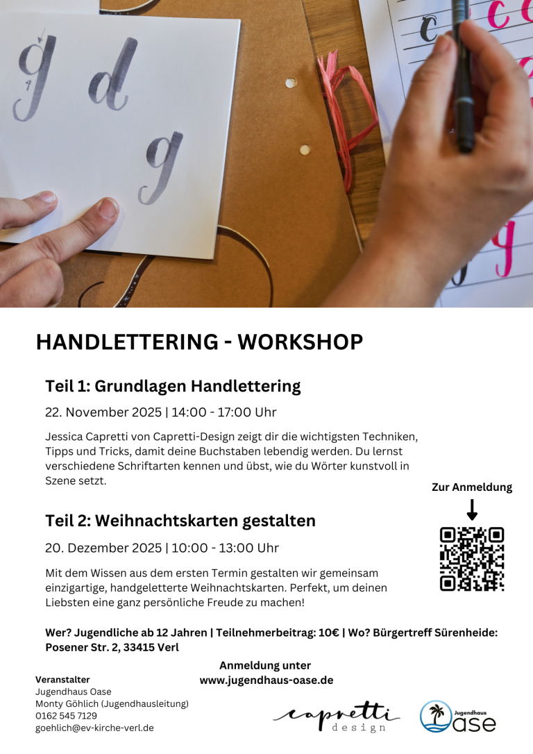 Lerne in zwei Terminen die Basics des Handlettering und gestalte mit deinem neuen Wissen super coole, handgemachte Weihnachtskarten. Geleitet von Jessica Capretti (Capretti-Design) findet der Workshop am 22.11. & 20.12.2025 statt.