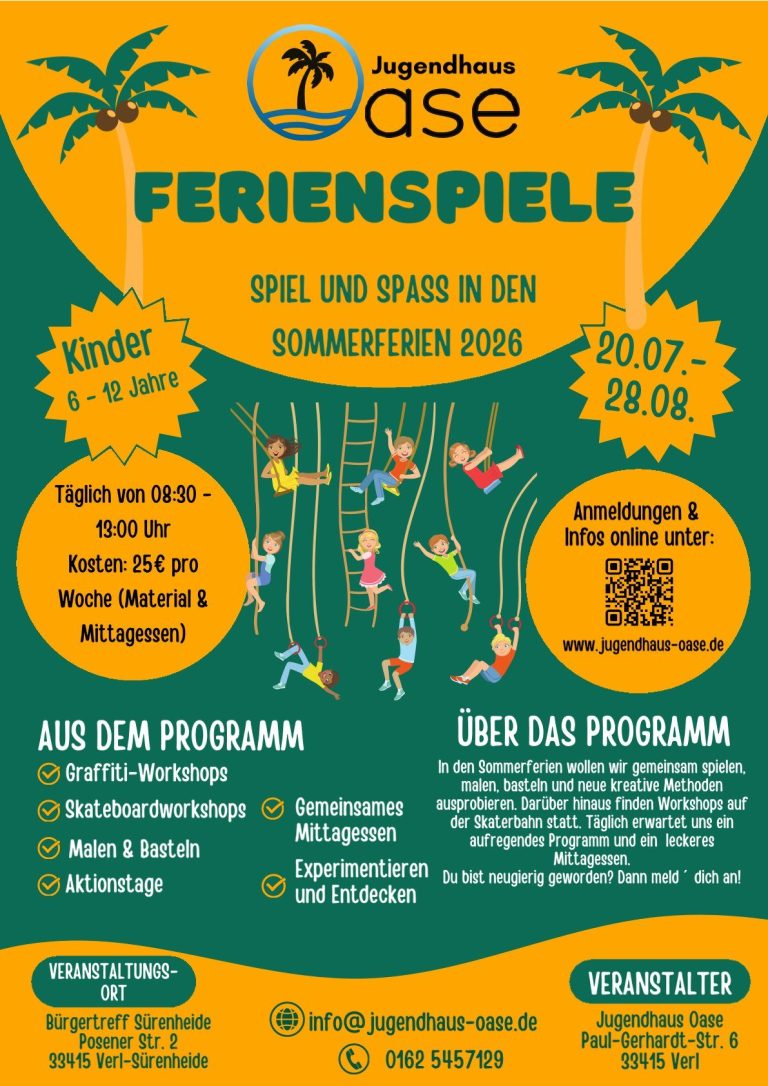 Das Jugendhaus Oase ist eine Einrichtung der Offenen Kinder- und Jugendarbeit in Verl-Sürenheide. Wir bieten Treffangebote, Ferienspiele, Kinderkino und viele weitere Aktionen und Projekte für Kinder und Jugendliche an.